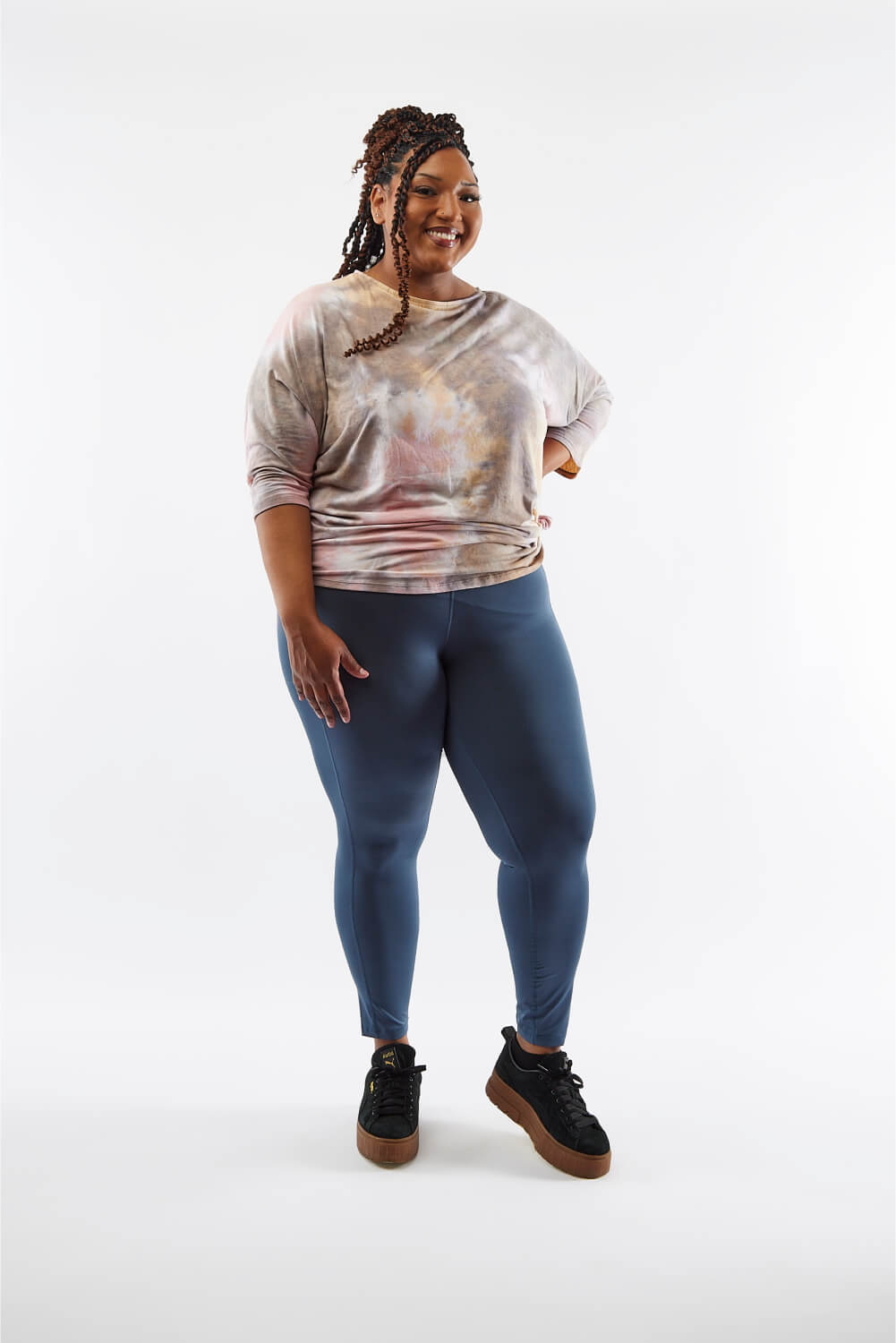 This earth-toned tie dyed top features a longer left side to tye and fit your hips perfectly.