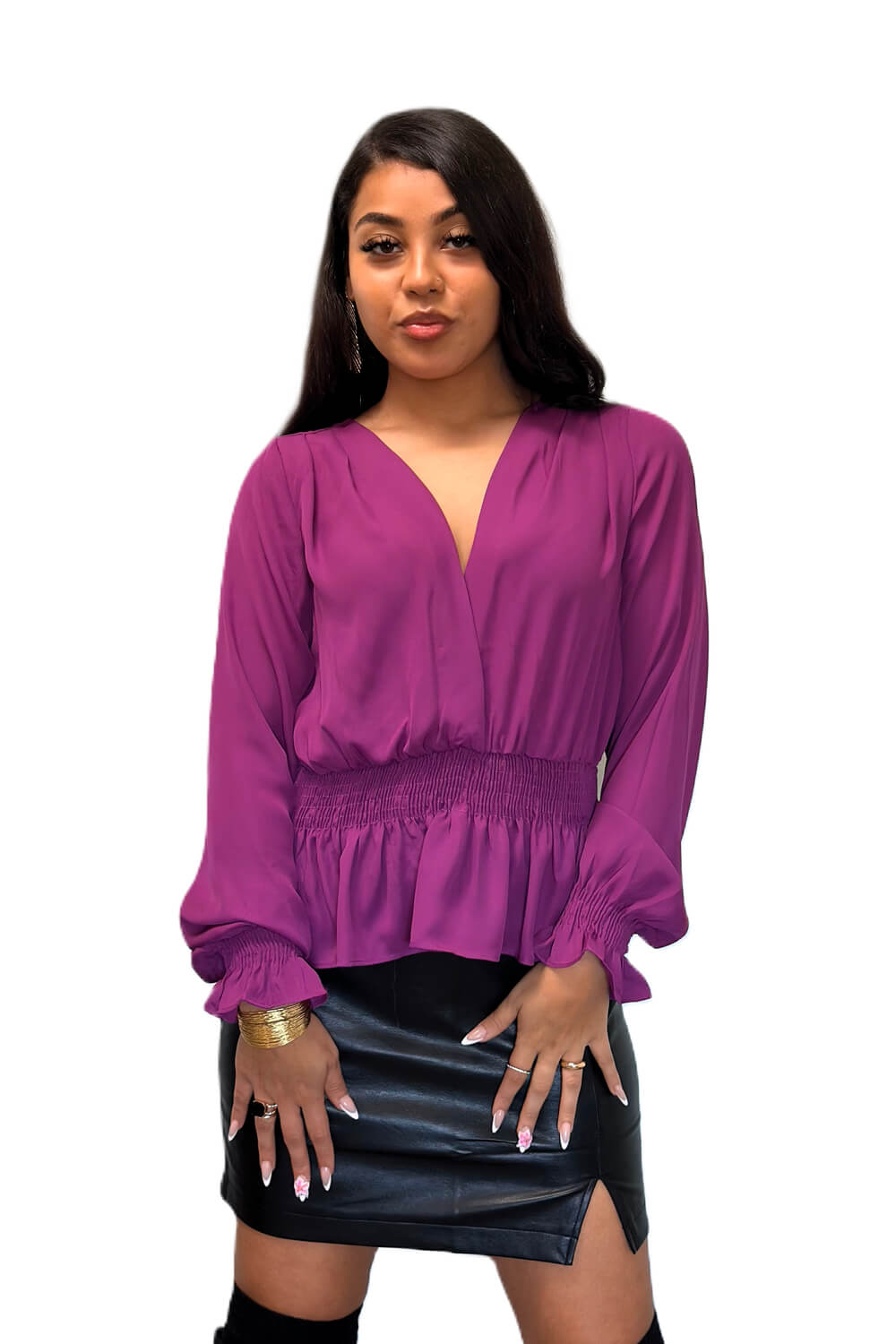 Stand out in this lightweight chiffon top featuring a deep V-neck and smocked waist, cinching in the right places.