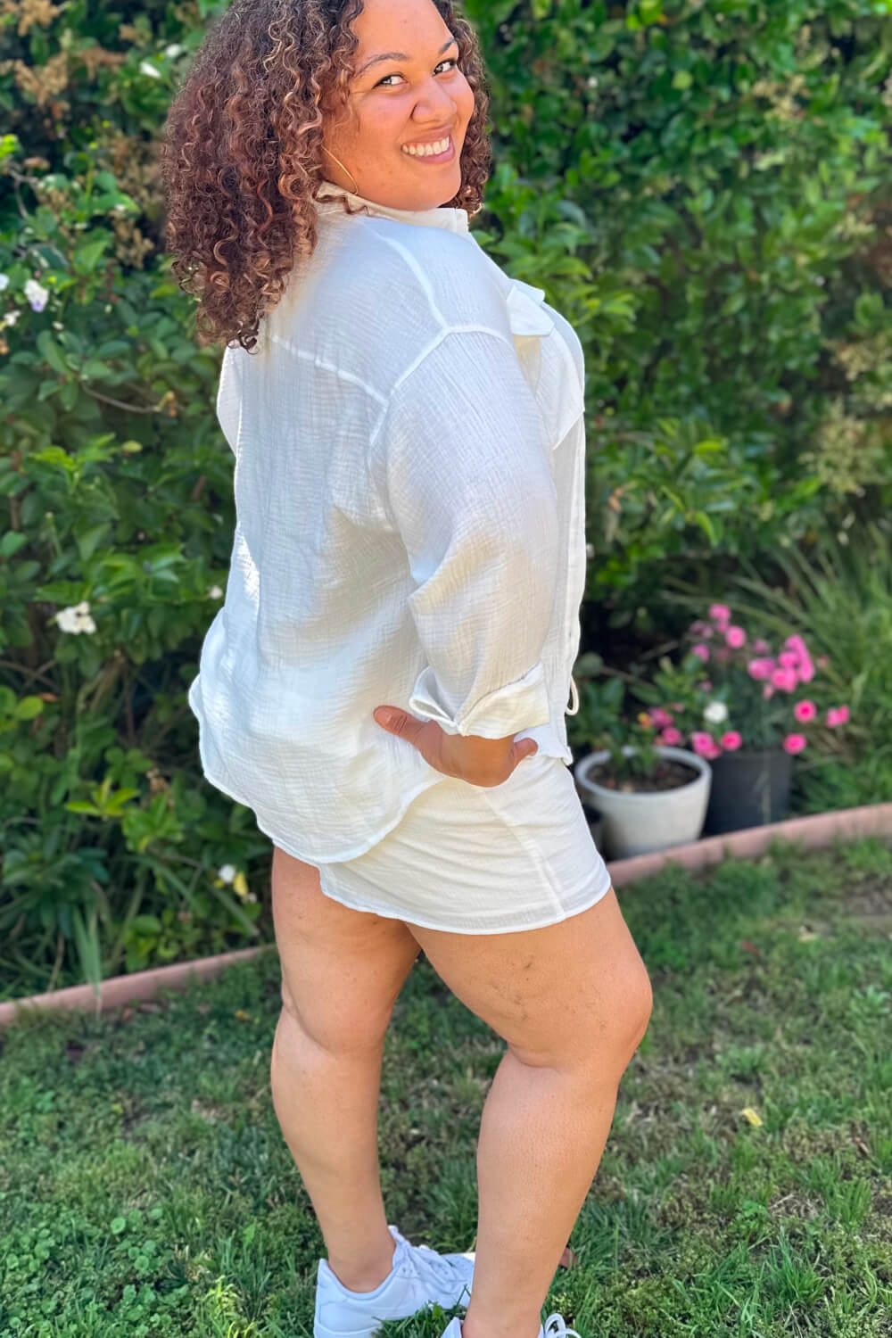 This oversized cotton shirt features two cargo pockets on the front, a scooped hem, and mother-of-pearl like buttons. Pair this with the matching short for a chic beach look.