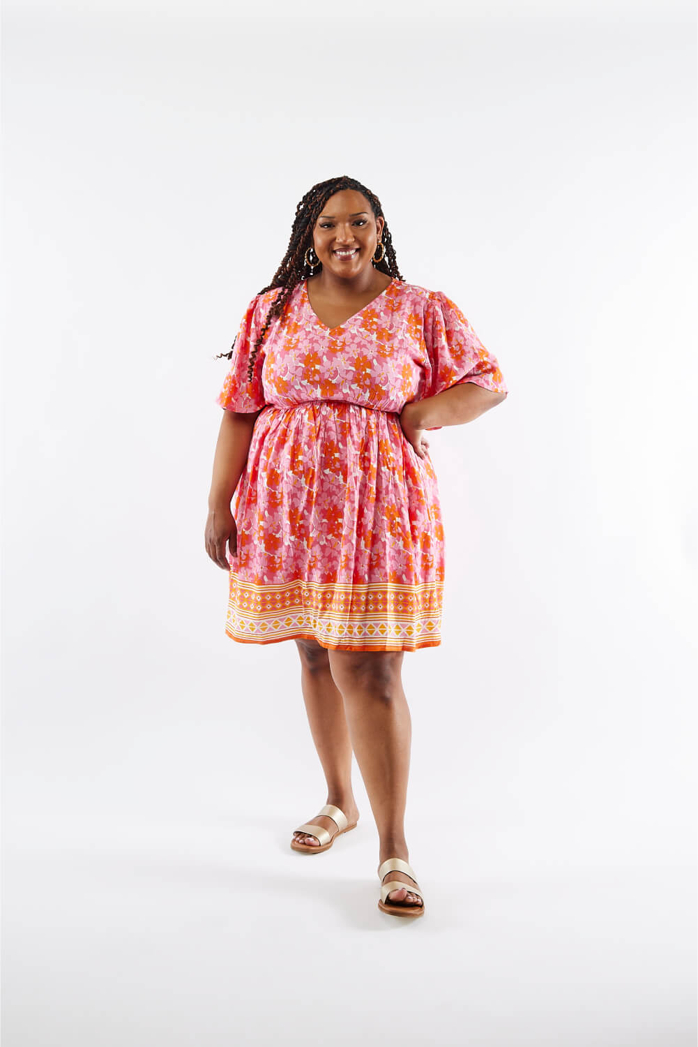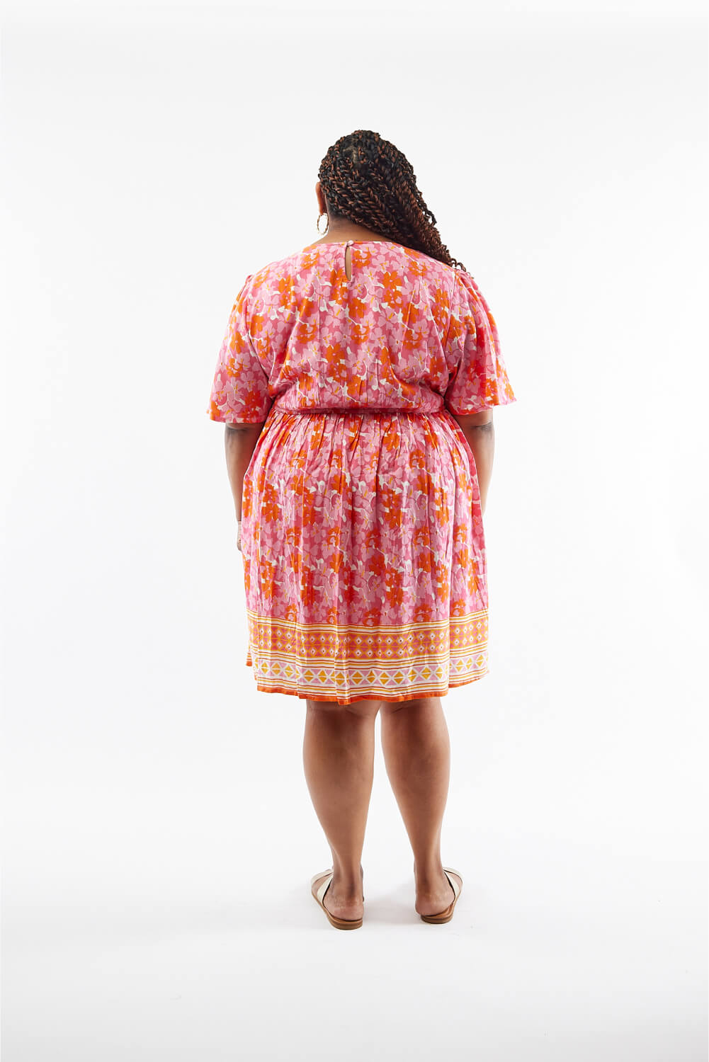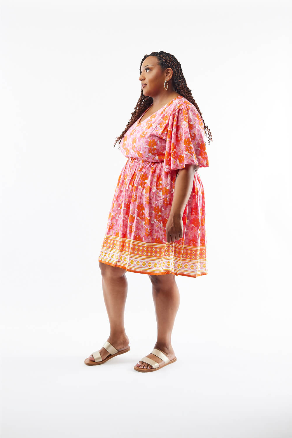 Summer is here! Dress the part in this floral and geometric number featuring butterfly sleeves. This dress is lined and has an elastic waist for a perfect fit.