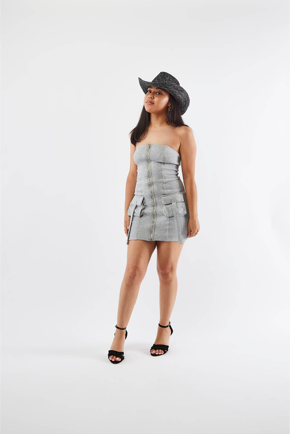 Look sexy and feel comfortable in this stretch, fitted mini cargo dress featuring a center zipper.