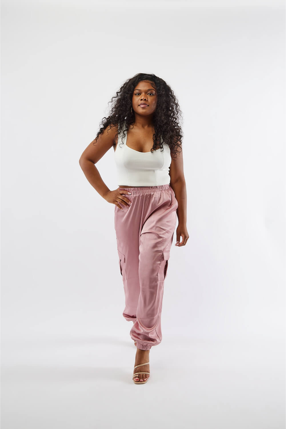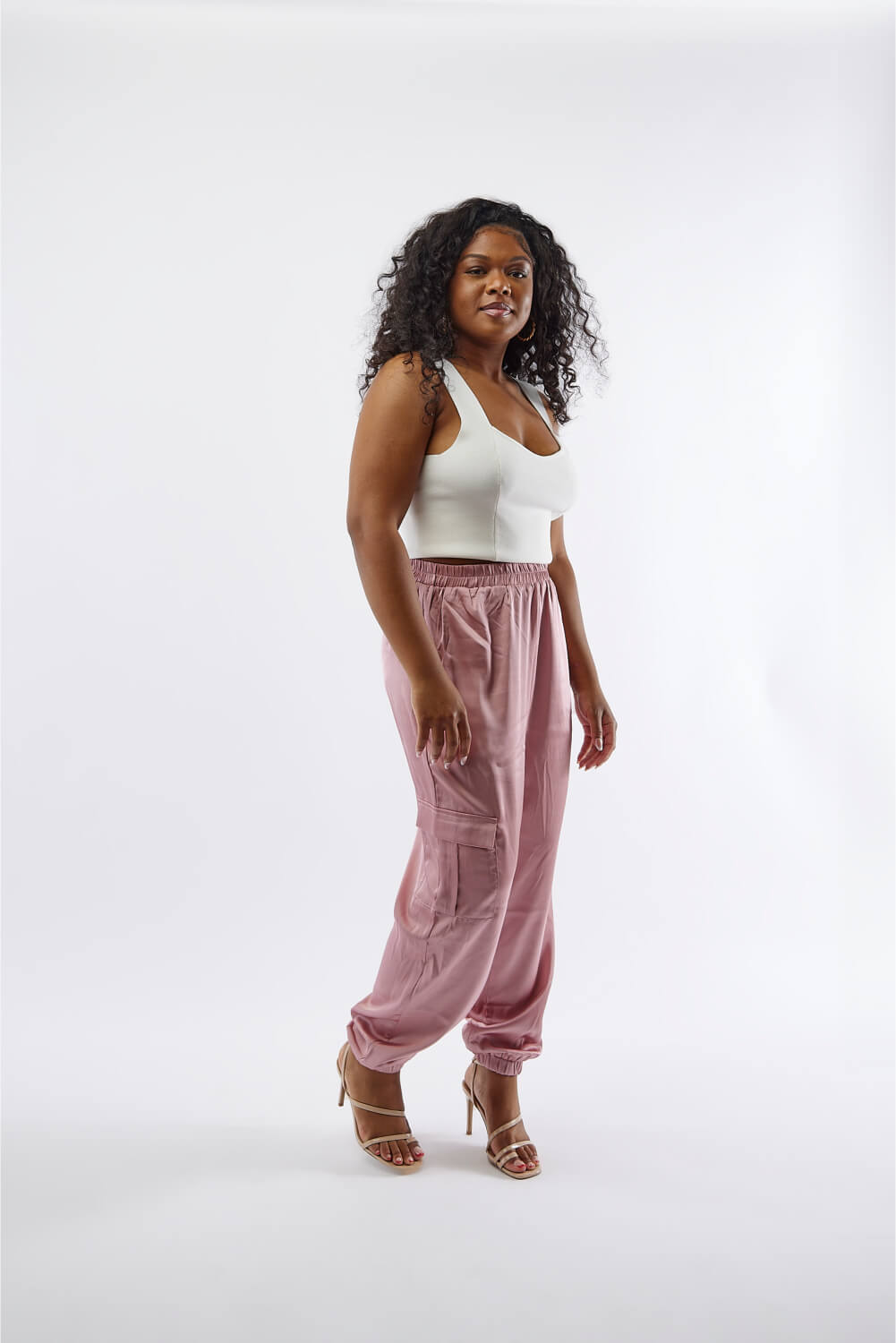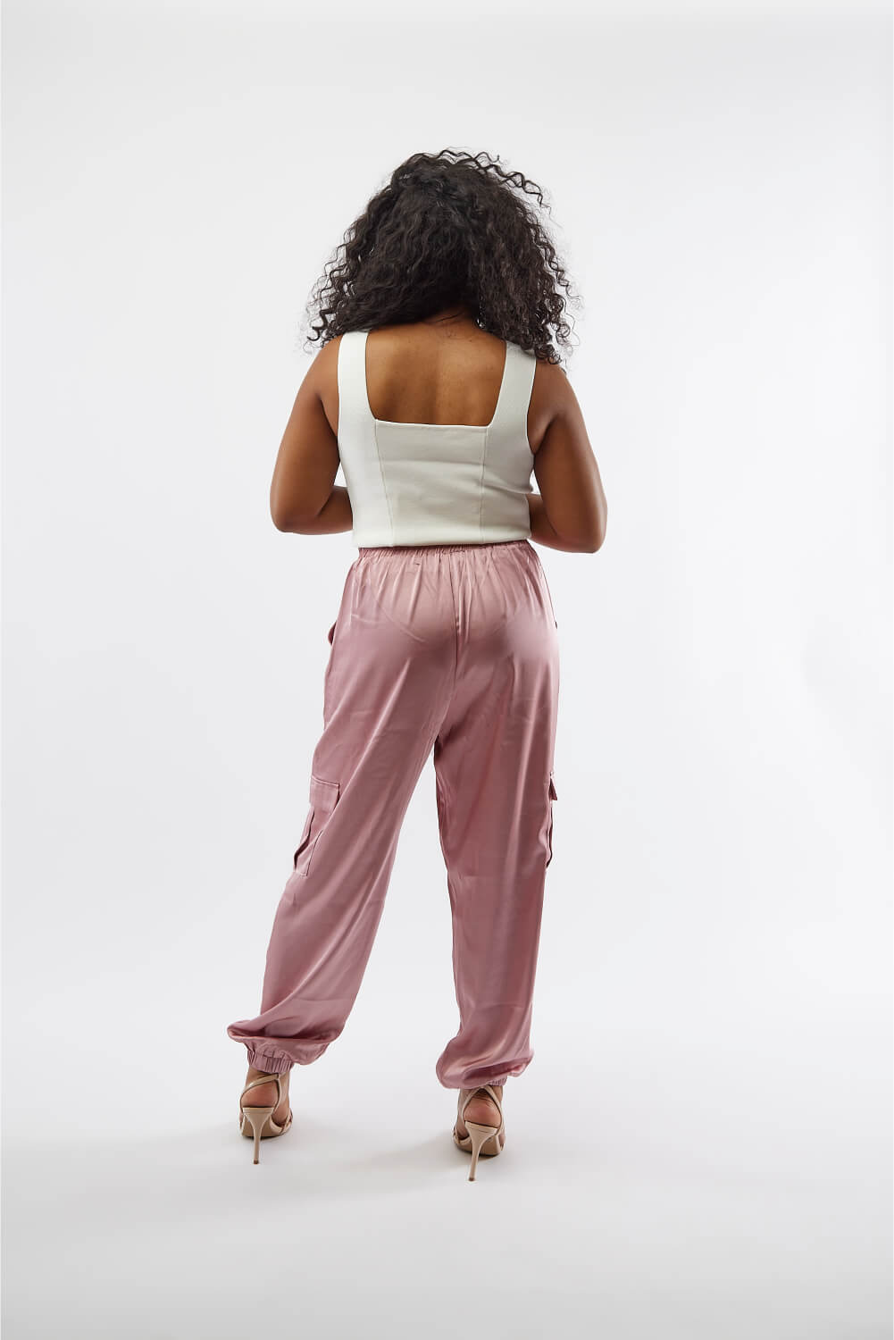 Elevate your look easily with these silky soft cargo pants. These pants feature an elastic waist, elastic hem at the ankles, and functional cargo pockets.