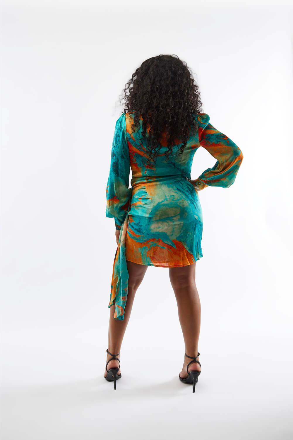 All eyes will be on you in this fiery number! This faux wrap dress is made of a vibrant and silky fabric with zipper enclosure, collar, and button details on the sleeve.